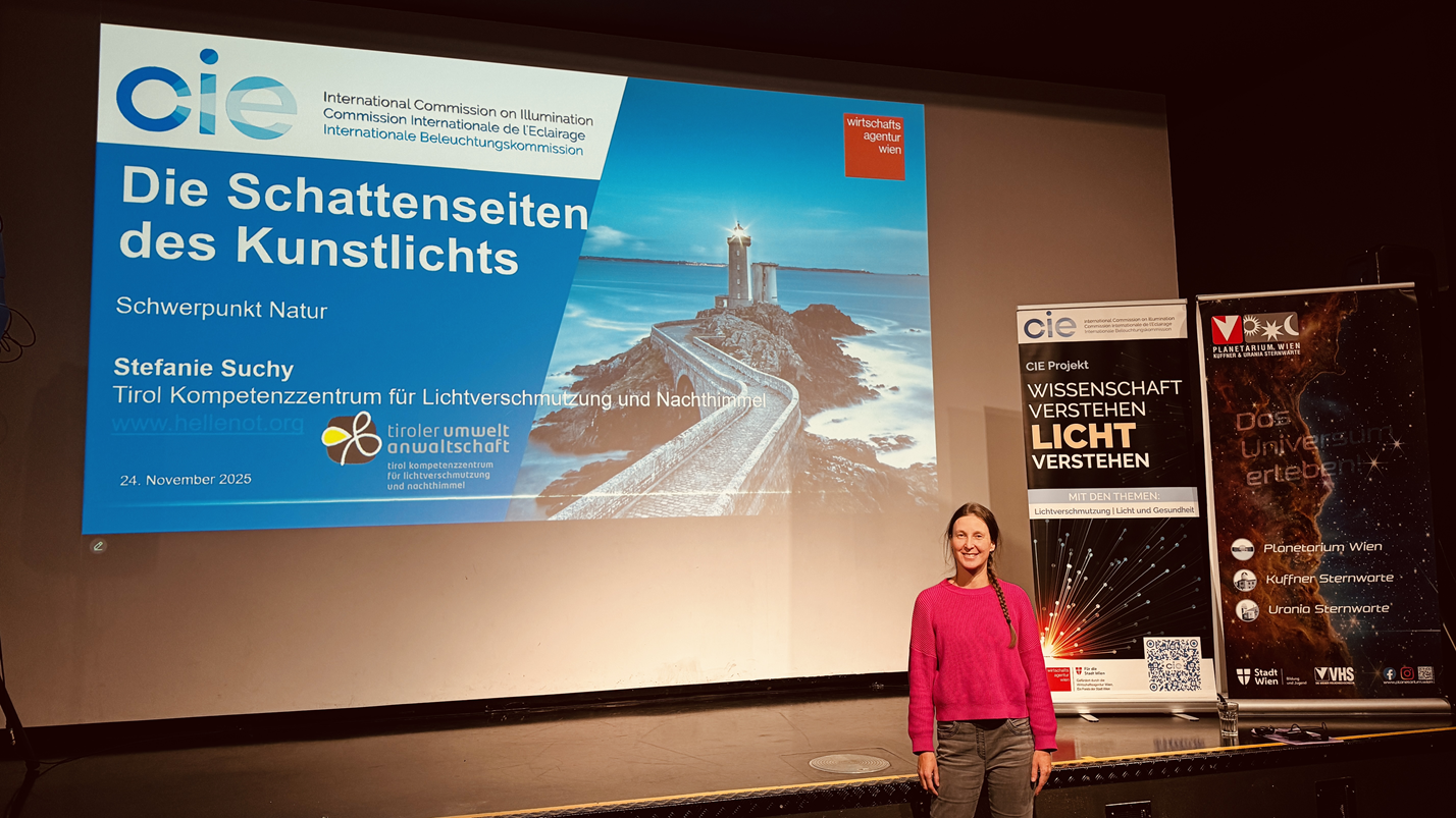 Am Abend des 24. Novembers 2025 fand im Wiener Planetarium der Vortragsabend „Die Schattenseiten des Kunstlichts” statt. Die Möglichkeit der Online-Teilnahme wurde rege genutzt und im Anschluss wurde ausgiebig diskutiert. Stefanie Suchy vom Tirol Kompetenzzentrum für Lichtverschmutzung und Nachthimmel (Tiroler Umweltanwaltschaft) vermittelte den aktuellen Wissensstand zu Lichtverschmutzung, deren Auswirkungen und zum verantwortungsvollen Umgang mit Kunstlicht.